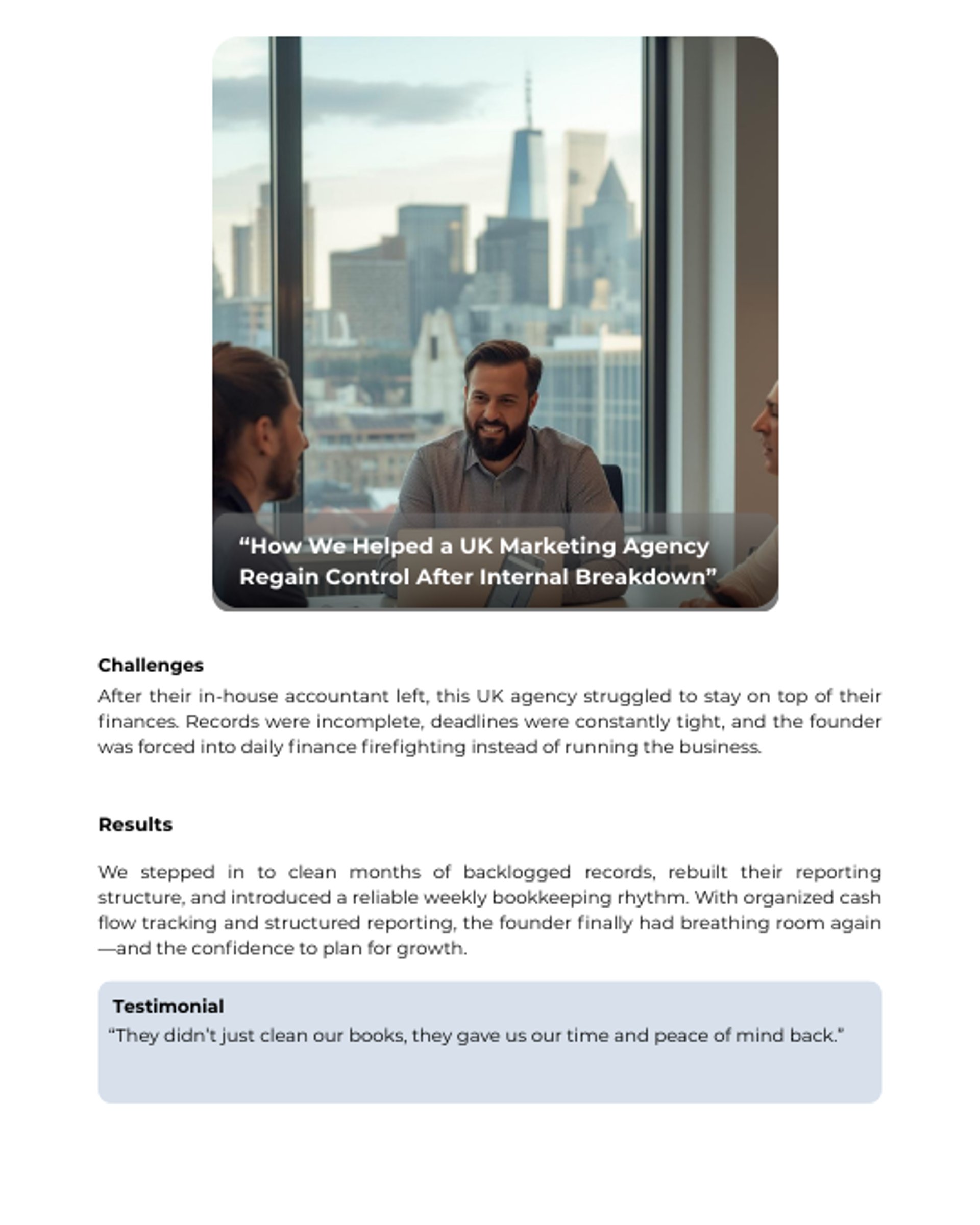 We specialize in service founders, agencies, consultants, coaches, startups, and boutique firms.